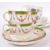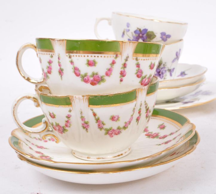 George Jones Crescent / Hammersley & Co - A collection of china porcelain two pattern part tea services. Comprising of 4x teacups and saucers by George Jones Crescent & Sons with rose swag garland design, and green and gilt rim. Also to include 5x teacups and 6x saucers, 2x cake / dessert plates, and milk jug stamped Hammersley & Co with violet floral decoration.