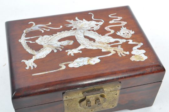 Two 20th Century wooden Chinese asian jewellery boxes. One having doors to front opening to reveal three drawers with red padded material to the interior; also having decorative brass mounts and inlaid carved stone door panels. Together with a lidded box having brass clasp to front and inlaid mother of pearl oriental dragon design, with cushioned red interior. Largest measuring approximately 18cm x 15cm x 10.5cm.