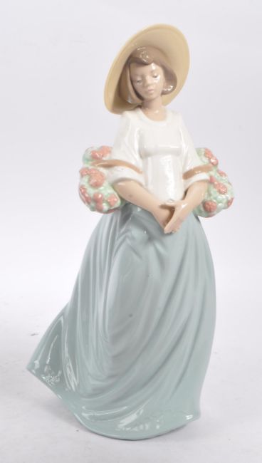 Nao by Lladro - A collection of five 20th Century china porcelain Nao by Lladro figurines to include a lady in summer hat with two baskets of flowers, a lady in 1920s style hat and clothes cradling a cat in jacket,a young girl leaning backwards on a wall with bird, a boy and girl together called ' A Tender Moment ' and a lady in white dress holding a flower. Tallest measures approximately 31cm.