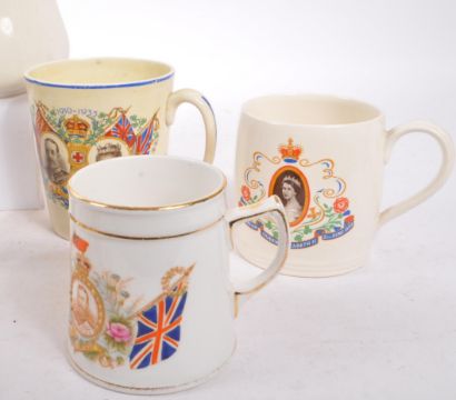 Collection of china celebrating the Silver Jubilee of King George V and Queen Mary 1910-1935 to include a bone china biscuit barrel with lid and woven carry handle, a number of mugs and cups, two small side / sandwich plates along with two mugs celebrating the coronation of the King and Queen dated June 22nd 1911.