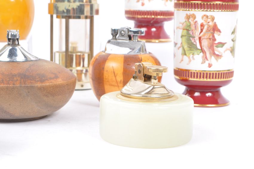 A large collection of 20th century table lighters. The collection to include a variety of examples, some of wooden construction, others with onyx, ceramic and stainless steel bases. Some examples marked for Ronson. Approximately thirteen examples in total.