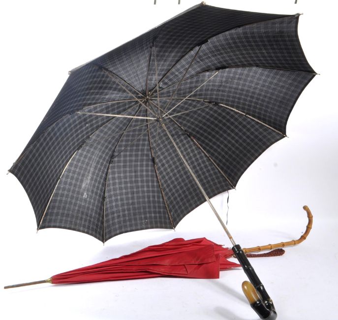 A 20th century Bamboo and Brass umbrella, with another of similar design. The umbrella featuring a long curved bamboo handle, with brass fittings and a red canopy. Measures approx. 88cm long.