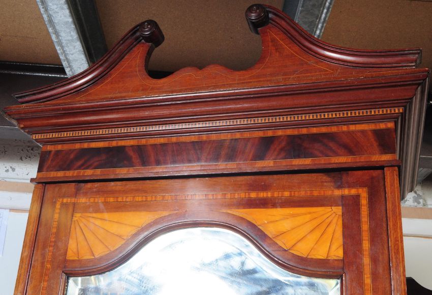 An Edwardian circa 1900s inlaid compactum wardrobe armoire. Of rectangular form with slot in gallery back and sides cornice. With full length beveled edge mirror door, opening to reveal a spacious interior to left. With a linen glazed cabinet to right above a bank of three graduating chest of drawers. With two parallel drawers to base on bracket feet and brass circular pull handles. Measures approx. 233cm x 146cm x 54cm.
