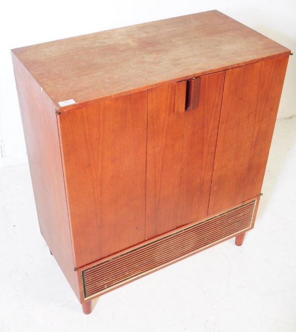 British Modern Design - A mid 20th century teak veneer Hi-Fi cabinet cupboard. The cupboard raised on tapered rounded legs, with folding doors to front, opening to reveal shelves to interior. AF. Measures approx. 85cm x 75cm x 40cm.