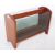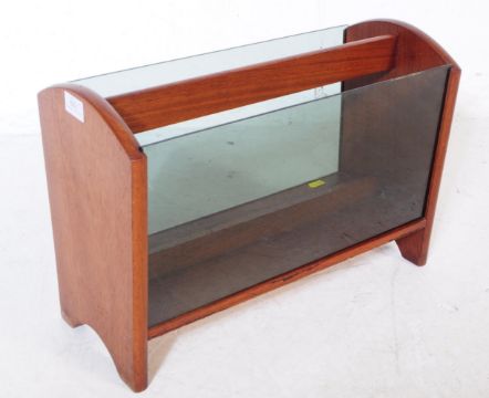 British Modern Design - A mid 20th century teak wood and smoked glass magazine rack alongside another wire example. The magazine rack having a teak wood body, with smoked glass sides. Alongside a bent wire atomic sputnik style example, with red ball feet. Measures approx 32cm x 46cm x 22cm.