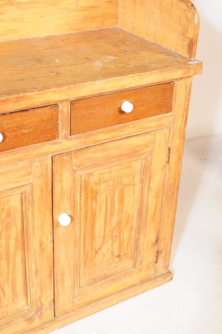 A 19th century Victorian pine sideboard dresser. The sideboard raised on a plinth base below two cupboard doors separated to center by a recessed fielded panel. Having three drawers across the front of the sideboard, each with ceramic handles, below a raised gallery back with shelf to top. Measures approx. 132cm x 138cm x 49cm.