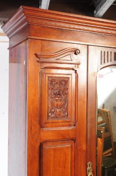 An early 20th century Edwardian arts and crafts circa 1900s walnut double wardrobe closet. Having a flared cornice, single bevelled edge mirror door flanked by carved panels and foliate design. Atop a single full length drawer, with brass swing handles raised on a plinth  base. Measures approx. 202x128x43cm
