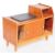 A retro mid 20th century teak veneer telephone table. Rectangular form with raised platform with pigeon hole to underneath, to left a black vinyl cushioned pad. Cabinet with single door to left, with another lager pigeon hole to right. All raised on circular wooden legs with chrome metal pull handles. Measures approx. 60cm x 75cm x 37cm.
