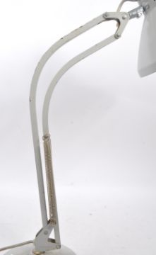 A mid Century metal industrial table top lamp having grey ground spring loaded support arm upon a circular weighted base with conical shaped shade. Measuring approximately 59cm tall.