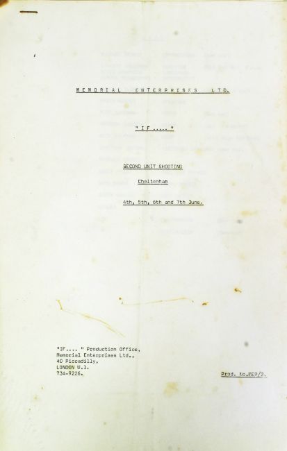From the collection of Vickers Staniforth - ' If.... ' (1968 British satirical film starring Malcolm McDowell) - a collection of original call sheets and general production ephemera. Includes Second Unit Shooting movement order, Accomodation Lists for shooting in Cheltenham, cast biographies, and other items.