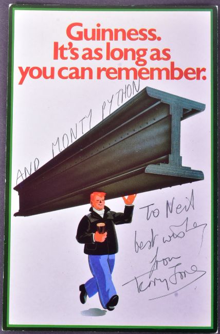 Monty Python - British Comedy Troupe - a selection of autographs on various items from members of Monty Python. Comprising: Terry Jones (d.2020) signed Guinness postcard with humorous addition in Jones' hand, Michael Palin signed note and photograph, Terry Gilliam signed photograph, and a typed note signed by John Cleese. All obtained in the 1970s by the vendor.