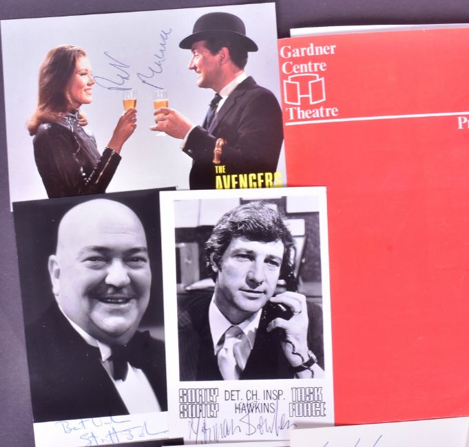 Autographs - a collection of autographs, all c1970s / 1980s actors from various TV programmes or films. Including: Patrick Macnee (The Avengers), Frank Windsor, Stratford Johns, Norman Bowler (Softly Softly Task Force official cast card), Bernard Hepton (Secret Army official cast card), Anthony Valentine, Jack Hedley, Anne Stallybrass, Peter Gilmore (Onedin Line photograph), Mary Tamm (official Dr Who cast card), Jon Pertwee (signed photograph with printed autograph but handwritten dedication), Bonnie Langford (official Doctor Who postcard), a Celebrity Football Match programme c1970s signed by William Franklyn / Leonard Rossiter / Jimmy Hill. Accompanied a collection of x6 vintage theatre programmes, all signed, to include the autographs of: Barbara Jefford, Jonathan Adams, Martin Connor, Jimmy Edwards, Patrick O'Connell, James Bolam, Malcolm Sinclair, and others. All obtained during the period by the vendor. (19)