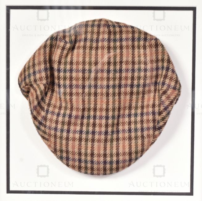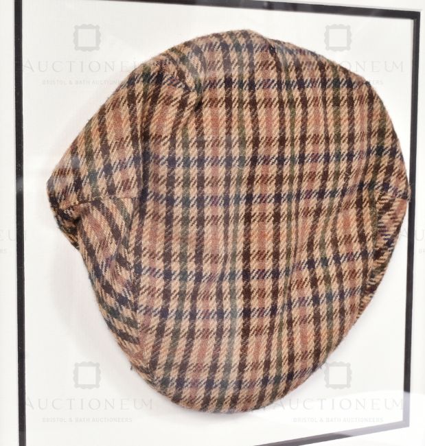Only Fools & Horses - an original screen used prop flat cap, as worn by Sir David Jason as Derek Trotter in various episodes. Woollen construction, with stripes in green, black and brown. Professionally mounted beneath an autographed image of Jason wearing his trademark flat cap. Signed in gold ink to a dark area of the image. Framed and glazed to a total size of 81cm x 42cm. Supplied with two certificates of authenticity from the Only Fools and Horses Appreciation Society (one for the cap, the other for the autograph)