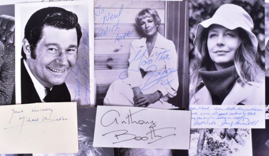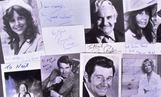 British Comedy - a selection of British Comedy related autographs, largely on photographs, to include: Ronnie Barker, Ronnie Corbett, Irene Handl, Anthony Booth, Michael Bates, Pat Coombs, Arthur Mullard, Yootha Joyce, Nerys Hughes, Stanley Baxter, Reg Varney, Alfie Bass, Windsor Davies, Tony Britton, Lynda Bellingham, Una Stubbs, Derek Nimmo, Diane Keen and others. (20)