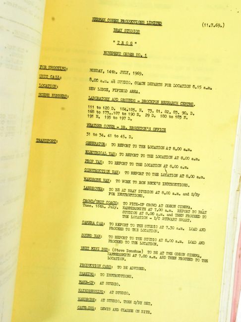 From the collection of Vickers Staniforth - ' Trog ' (1970 British sci-fi horror film starring Joan Crawford) - a collection of original production material comprising Call Sheets and Movement Orders. All as used during production in 1969.