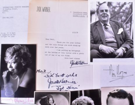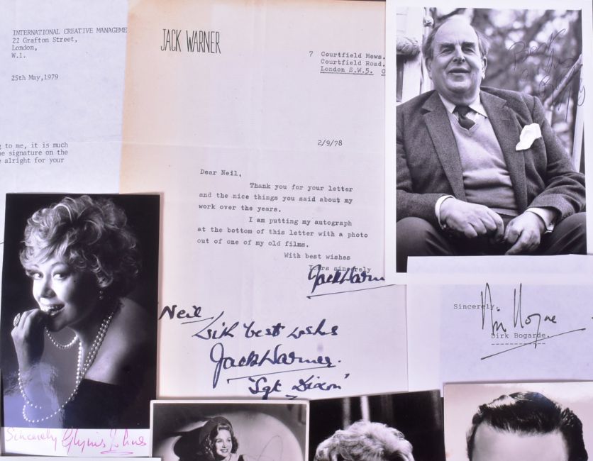 British Actors - Autographs - a collection of autographs on photographs and paper, all British actors, to include: Robert Morley, Margaret Lockwood, Kenneth More, Phyllis Calvert, James Mason, Jack Warner, Lionel Jeffries, Glynis Johns, Dawn Addams, Richard Todd, Dirk Bogarde, Trevor Howard, Gracie Fields, David Tomlinson and Jean Kent. Various sizes. (15)