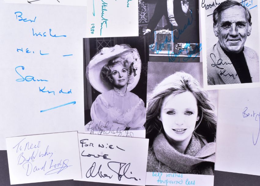 Autographs - British Actors - a collection of autographs on photographs, cards and paper from British actors c1970s / 1980s. Includes: Sam Kydd, Leonard Sachs, Graham Stark, Patricia Hayes, Jean Anderson, Moira Lister, Andrew Cruikshank, Gary Bond, Norman Rossington, Ronald Leigh-Hunt, Anthony Bate, Allan Cuthbertson, Nicholas Ball, Angharad Rees, Peter Barkworth, Rosemary Leach, David Lodge, Jack Shepher, and Oliver Tobias (19)