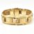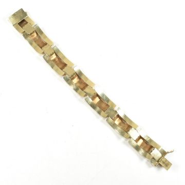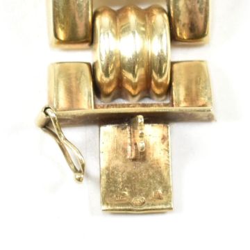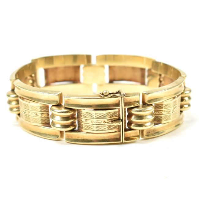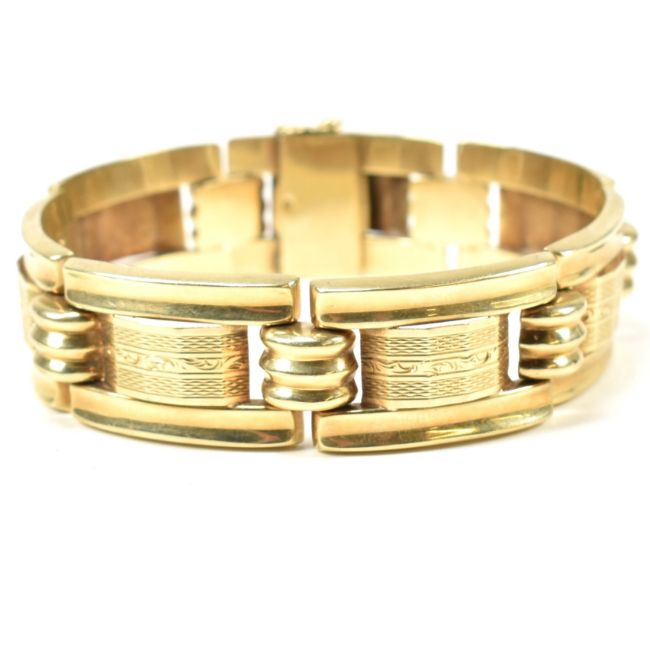 A 14ct gold yellow gold bracelet. The bracelet formed with rectangular tank style links with etched decoration having domed ribbed spacers.  Marked 585. Tests confirm 14ct gold. Weight 30g. Measures 19cm. Weight 30g. All weights, measurements and sizes are approximate.