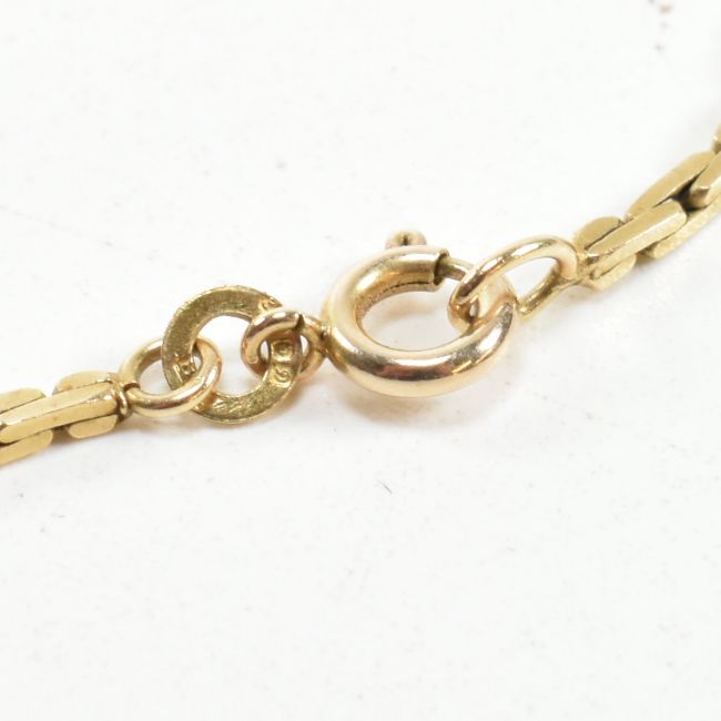 A hallmarked 9ct gold fancy flat link chain. The flat link chain hallmarked for London, 1978. Also marked 9KT Germany. Measures 62.5cm. Weighs 10.5g. All weights, measurements and sizes are approximate.