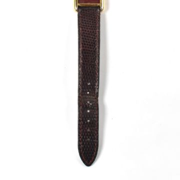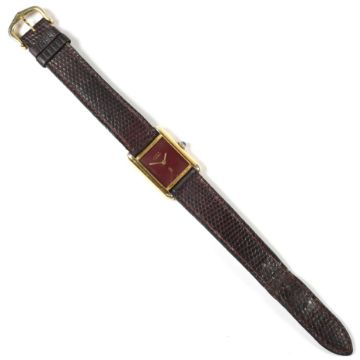 Vintage Must De Cartier tank watch. The watch having a rectangular burgundy dial in a gold plated silver case having blue cabochon to crown. Marked Cartier Paris 925 with flower and swan mark. Argent Plaque Or G 20 M. Swiss 3 137445. Original Must de Cartier leather strap. Case measures 23mm.