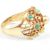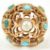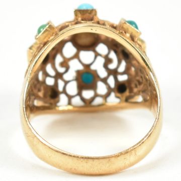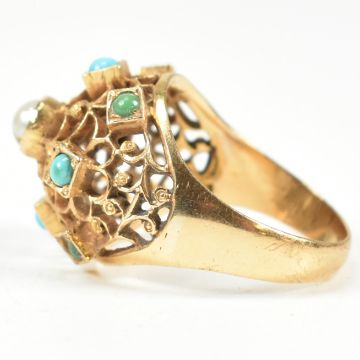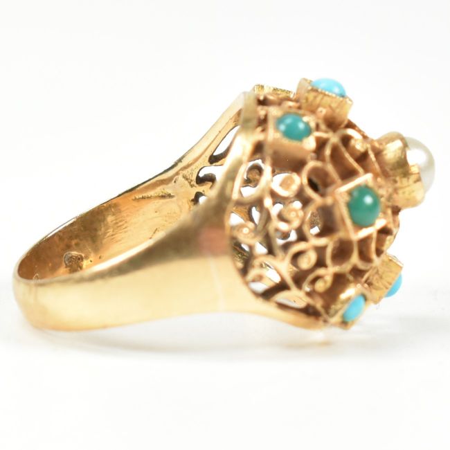 An 18ct gold pearl and turquoise bombe ring. The ring having a pierced filigree style domed head set with a central pearl with green and blue turquoise accents. Stamped 750 with continental assay mark. Weight 7.2g. Size N.5. All weights, measurements and sizes are approximate.
