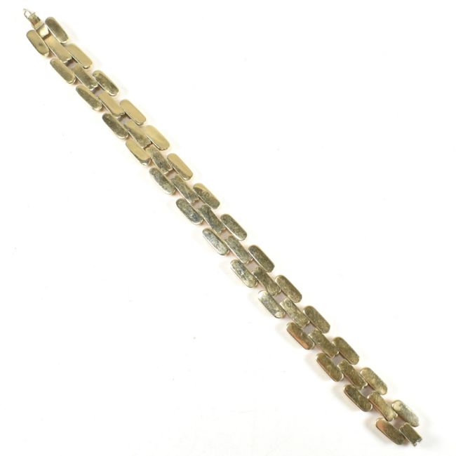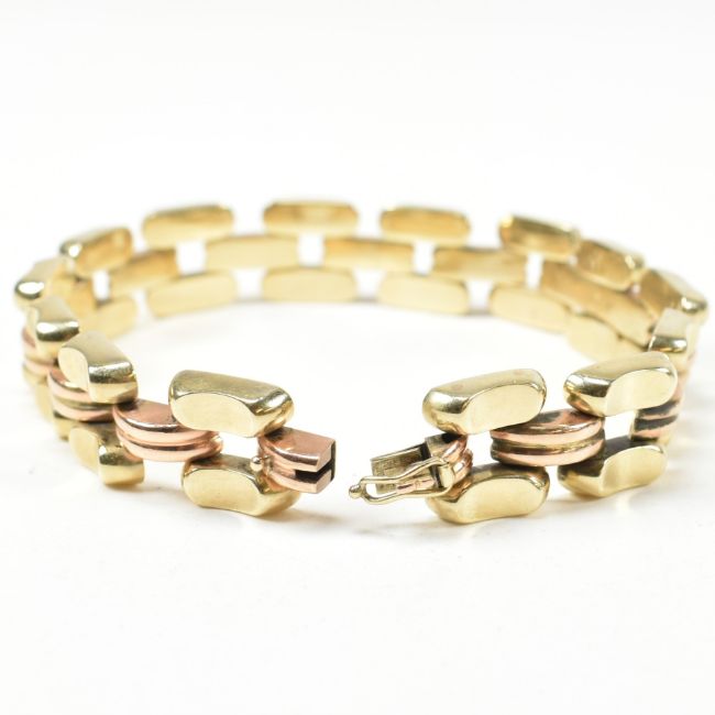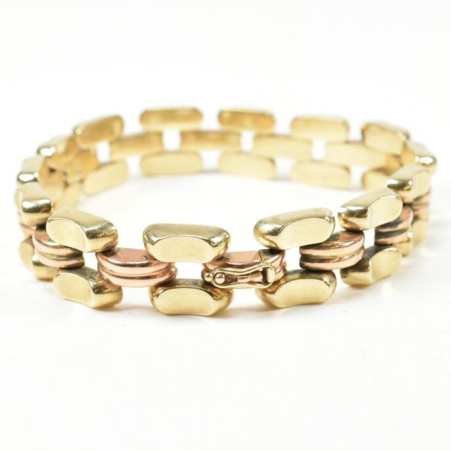 A 14ct bi colour gold bracelet. The bracelet formed with concave and fluted links in yellow and rose gold having snap clasp fastener. Marked 585 Helm with continental assay mark rubbed. Tests confirm 14ct gold. Weight 20.6g. Measures 19.8cm. All weights, measurements and sizes are approximate.