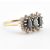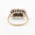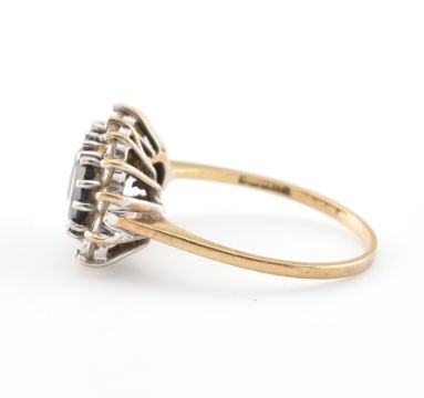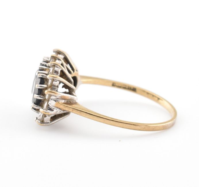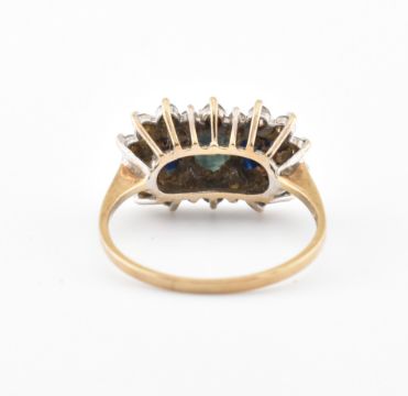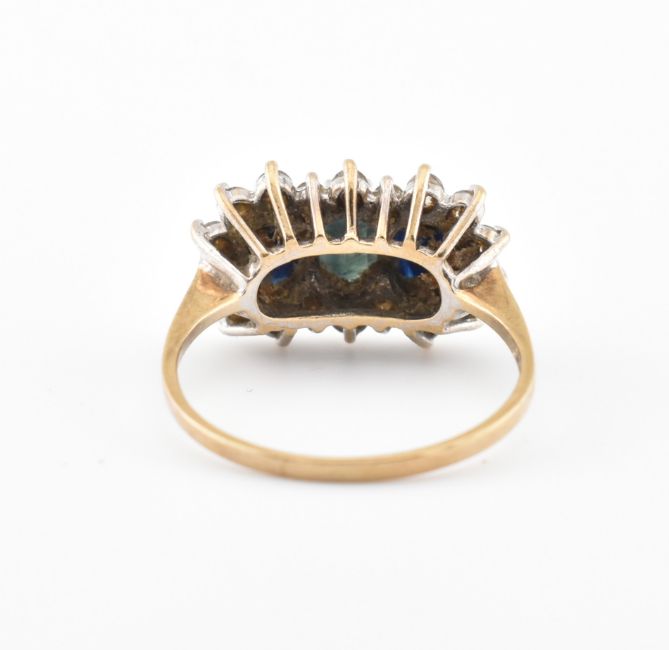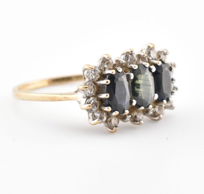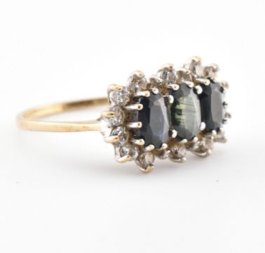 A hallmarked 9ct gold sapphire and CZ ring. Hallmarked Sheffield, the ring set with three sapphires within a halo of CZ's. Weight 2.7g. Size N.5. All weights, measurements and sizes are approximate.