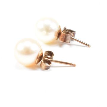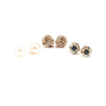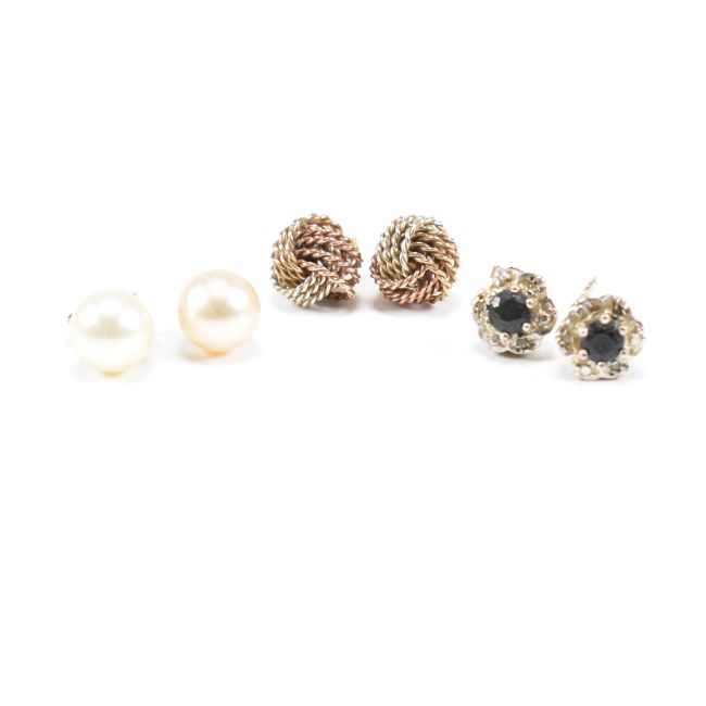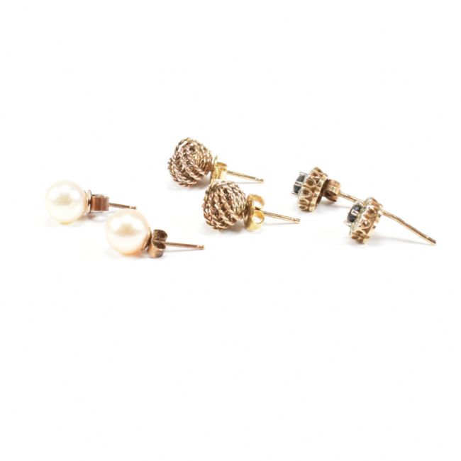 Three pairs of gold earrings. The earrings to include knot marked 375. Cultured pearl unmarked. Sapphire cluster hallmarked. Weight 4g. All weights, measurements and sizes are approximate.