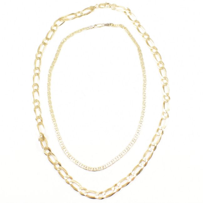 Two hallmarked gold on 925 silver chain necklaces. The necklaces to include a hallmarked Italian gold on 925 silver curb link chain. Hallmarked for Sheffield. Sponsor's mark TJC. Marked 925 and ITALY. A hallmarked gold on 925 silver mariner link chain. Hallmarked for Birmingham, 1972. Marked 925. Both necklaces having lobster claw clasps. Italian curb chain measures 61cm with links that measure 1cm and 1.5cm. Mariner link chain measures 47cm. Combined weight 50g. All weights, measurements and sizes are approximate.