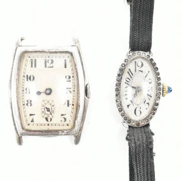 Two early 20th century silver watches. A silver watch having a stone set bezel the blue cabochon stone winder to ribbon strap 925. Together with a hallmarked silver watch for Glasgow 1929, maker SD. Weight 30.2g. Largest measures approx 4x3cm.