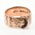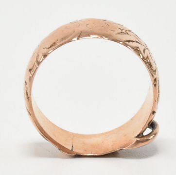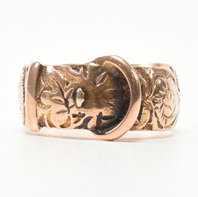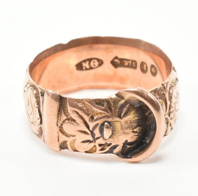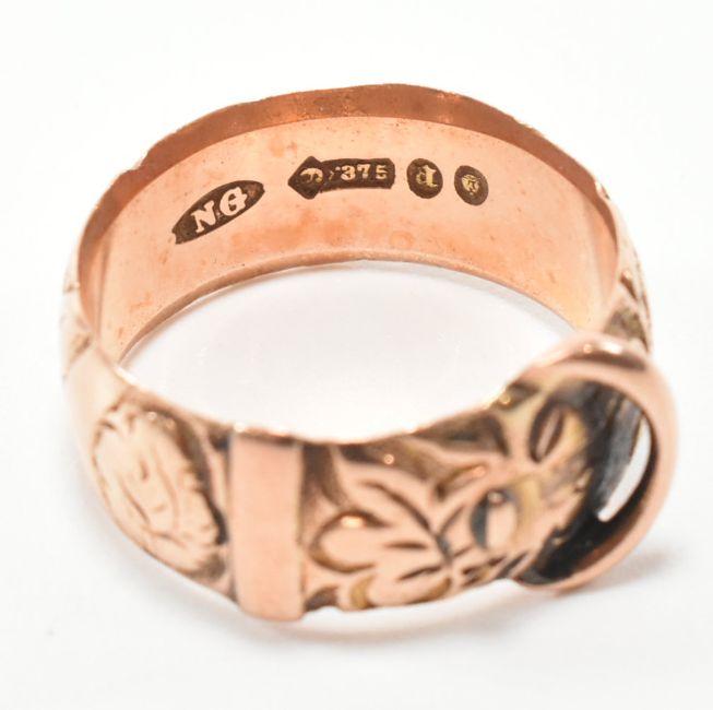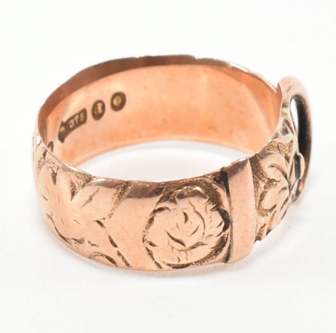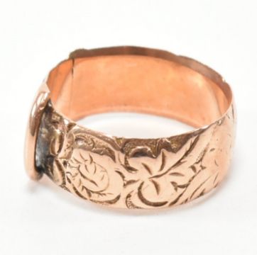 An antique hallmarked 9ct rose gold buckle ring. The ring in the form of a fastened belt and having etched foliate decoration throughout, AF pin missing from buckle. Hallmarked for London 1916, makers marks for NG. Total weight approx 6.5g. Approx size Q. Band measures approx 9mm. All weights, measurements and sizes are approximate.