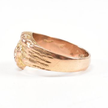 A 9ct gold lion head ring. The ring with central lions head design to plain band. Unmarked, tests indicate 9ct gold. Weight 9.3g. Size U.5. All weights measurements and sizes are approximate.