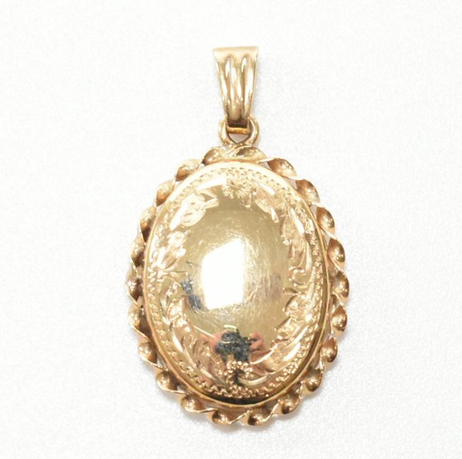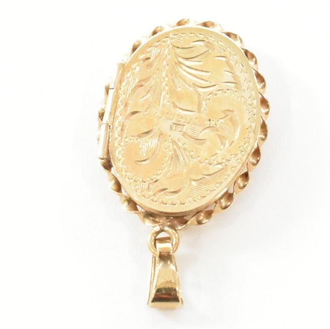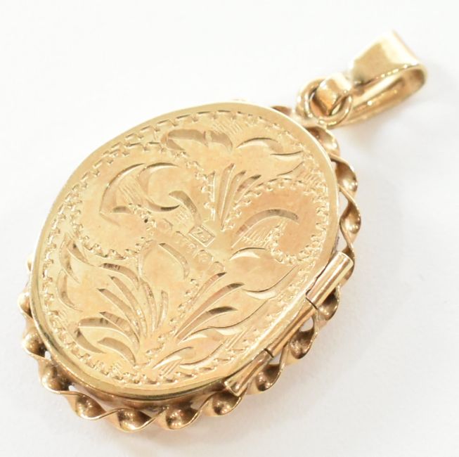 A hallmarked 9ct yellow gold locket necklace pendant. The locket of oval form having a twisted and etched border to the front and scrolling foliate detailing to the verso with hinged opening and gadrooned bale. Hallmarked for Birmingham 1991. Total weight approx 2.7g. Measures approx 3cm including bale. All weights, measurements and sizes are approximate.