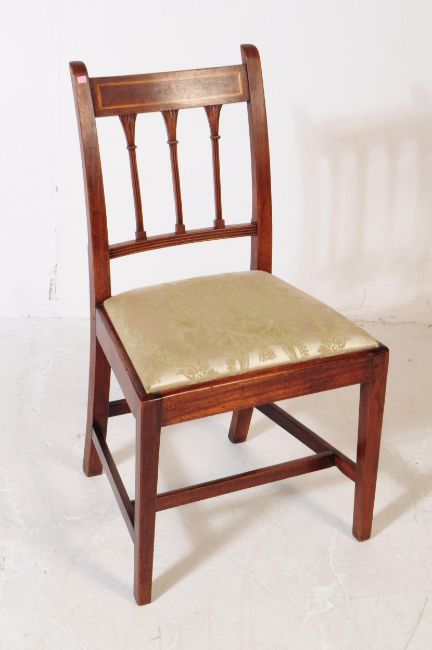 A 19th century North Country oak wood hall chair, alongside a hall table / washstand and another chair. The North Country chair featuring a horizontal carved pierced back slat raised on shaped squared supports above a plank seat. The lot to include an oak wood washstand with two tiers raised on squared supports united to lower by stretchers, and another chair featuring patterned upholstered drop in seat cushion and shaped spindles to back. Measures approx. 81x39x39cm