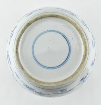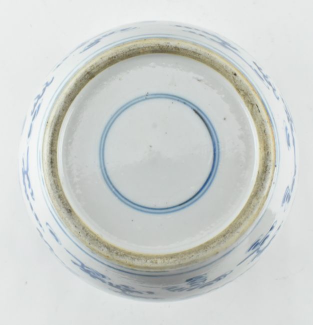 A porcelain blue and white twin dragon with pearl jar with wooden lid, late Qing period. The jar decorated with two dragons and pearl, along with scrolling clouds. Double ring mark to the base. Measures approx. 22cm tall.
