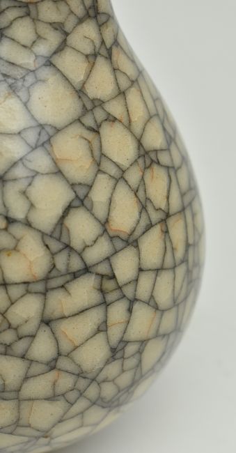 A small Geyao crackled long necked vase. The vase having a flared long neck with globular shape body. Embossed Feng-Hua mark to body. Measures approx. 16.5cm tall.