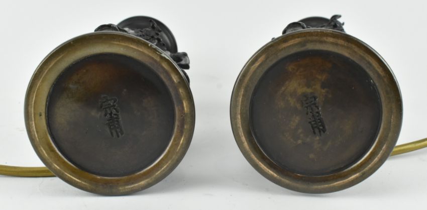 A pair of Japanese Meiji period heavy bronze candlesticks converted to lamp bases. The candlesticks cast in a form of pagoda, depicting a dragon, below a bulbous form with relief birds with lion-head handles, raised on a four lion head scroll feet base on a step. Sold as untested. Measures approx. 22cm tall x 8cm diameter.