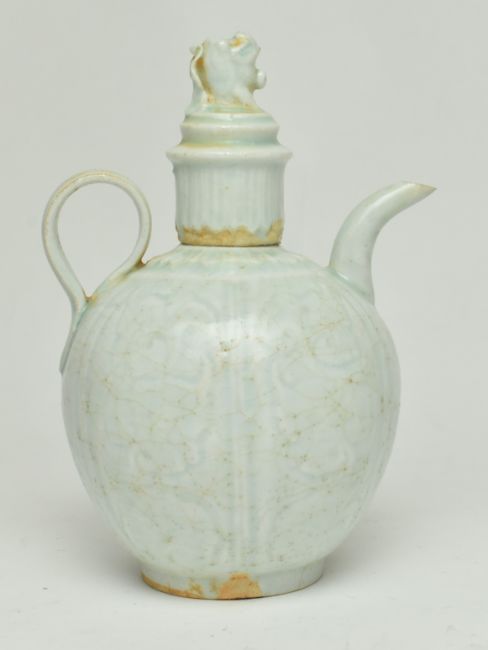 A late Qing or later North Song style pale aqua glazed Qingbai ewer. The body potted with six lobes to rise to an overlapping lotus petal collar at the base of the trumpet neck. The cover surmounted by a Buddhist lion finial. Measures approx. 16cm tall x 11cm diameter.