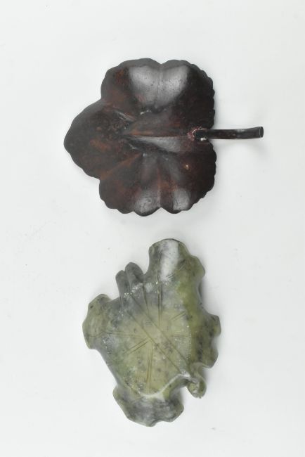 一组四件包括一件清代外贸茶杯带底座, 一件20世纪出口茶杯带底座, 一件20世纪玉荷叶造型笔洗和一件铜枫叶造型碟子。
