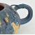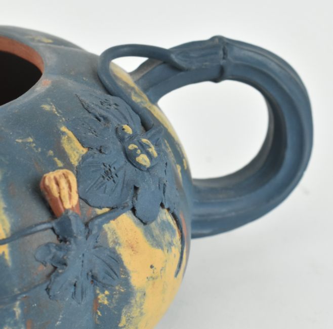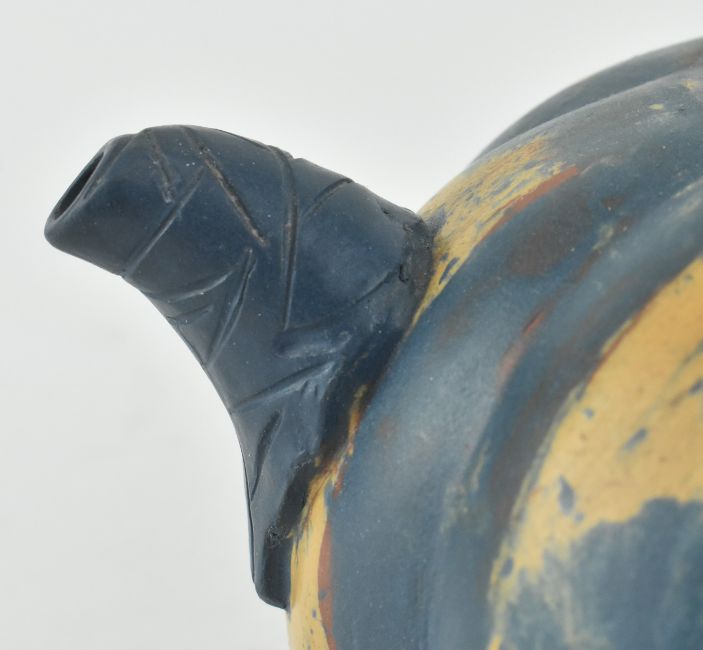 A 20th century Chinese zisha clay teapot. The teapot moulded in the form of a pumpkin and glazed with teal and orange. Presented with wooden stand. Measures approx. 9cm tall x 20cm diameter including the handle.