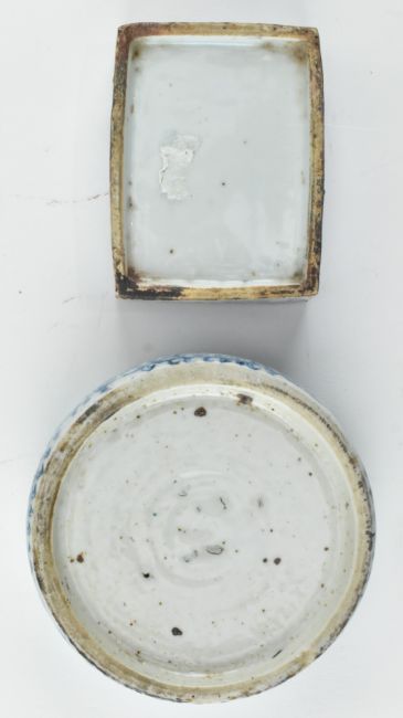 A Qing dynasty blue and white inkwell and a seal paste box. The inkwell decorated with flower and foliage and the seal paste box decorated with flower and fret tendrils along the cover. Ink well measures approx. 2.5cm tall x 9.5 cm diameter and the seal box measures 3.5cm x 8cm long.