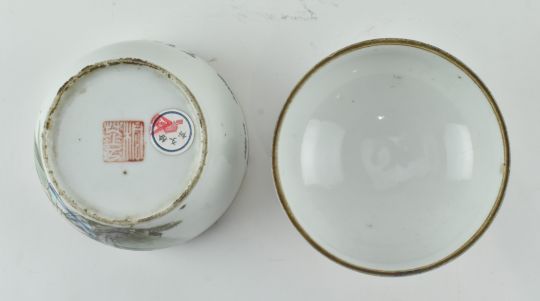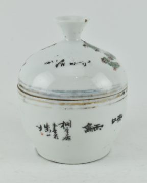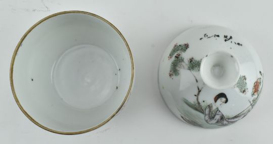 A Republic period famille rose jar with lid. The jar depicting a young lady & boy in the garden. The lid featuring a young maiden with flowers and tree. Measures approx. 13cm tall x 10.5cm diameter.