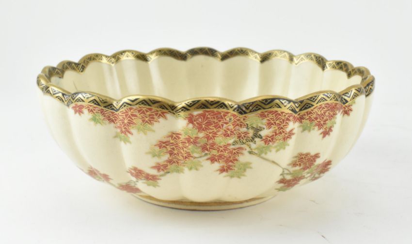 Two Japanese Satsuma bowls. The lot comprising one Meiji period circa 1890-1900 satsuma bowl decorated with a landscape of houses and mountain in the well. Green ground gold scrolling on the rim. The exterior decorated with grapes and wine leaves. Further, a lobed bowl depicting a scene of pheasant by the river among flowers. Largest measures approx. 7cm tall x 18.5cm diameter.