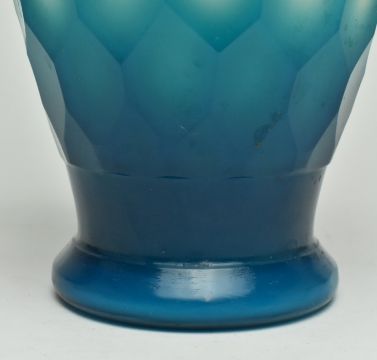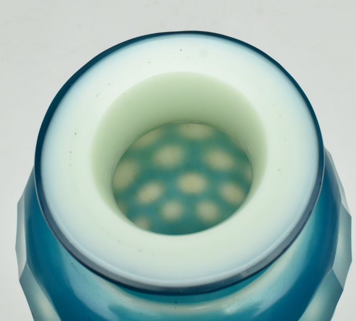 A Republic period Peking faceted blue vase. The vase featuring deep blue to turquoise overlay, cut through to the opaque white body with a geometric honeycomb pattern. Measure approx. 28cm tall.
