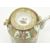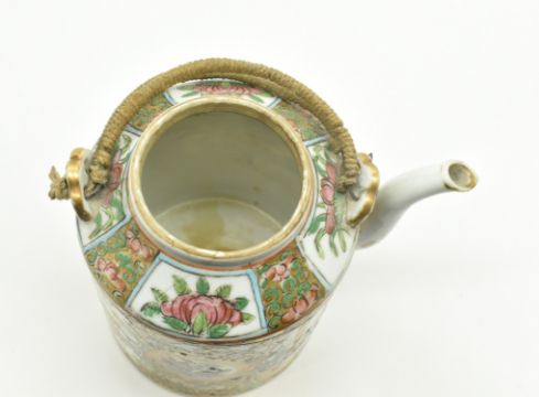 A Qing dynasty Canton famille rose teapot with woven tea cosy basket. The teapot decorated with figures in garden surrounding by peonies, lotus, birds and butterflies. The woven tea cozy basket having twin copper handles and a lock. Some restoration to teapot. Basket measures approx. 16cm tall x 16.5cm diameter; teapot measures approx. 13cm tall x 14cm diameter including the spout.