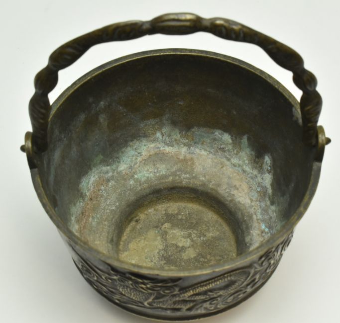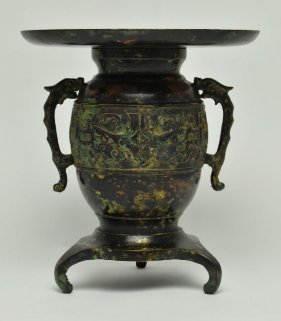 Two Japanese bronze pieces. The lot comprising a Meiji period bronze censer plant pot decorated with two embossed dragons with clouds and a moulded handle, and an archaic style bronze plant pot with twin dragon handles raised on a tripod base. Largest measures approx. 19cm x 17cm diameter .