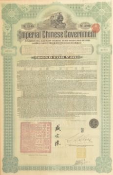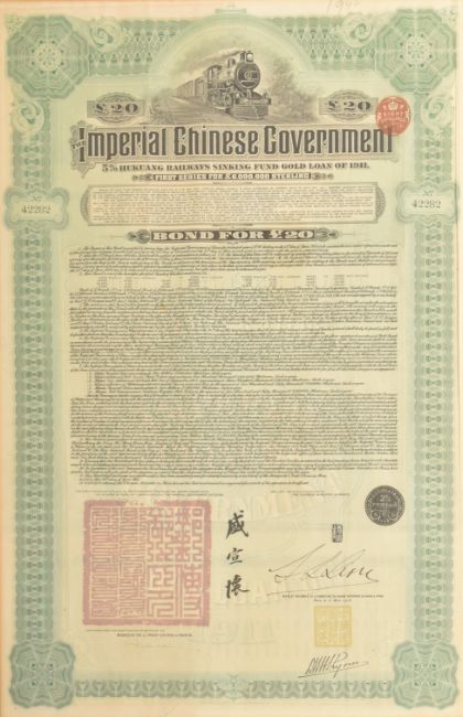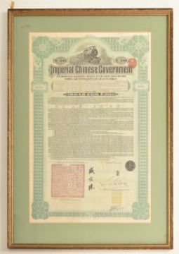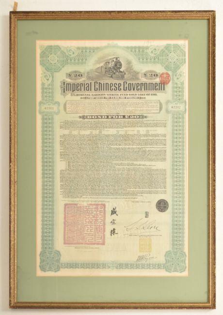 An early 20th century 1911 Imperial Chinese Government £20 5% Hukuang Railways 湖广铁道 sinking fund gold loan paper bond. Framed & glazed. Together with a North Butte Mining Company 10 shares paper certificate bond from the State of Minnesota. Largest measuring approx. 54cm x 35cm excluding frame.