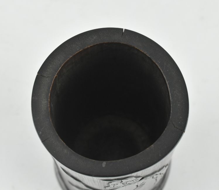A Republic period bamboo brush pot / incense pot. The bamboo pot featuring a carved poem verse and a scholar holding a walking stick. Measures approx. 13cm tall x 6cm diameter.