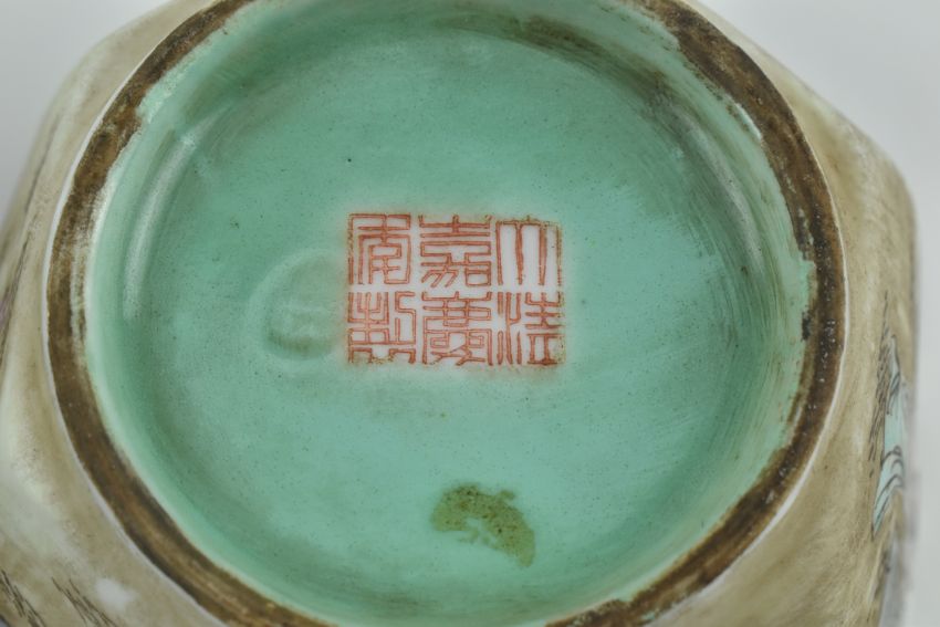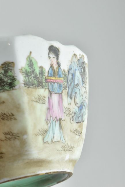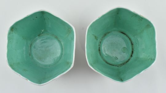 A pair of famille rose hexagonal bowl. Each bowl depicting seven maidens in Ming dynasty clothes. Green glazed to the well. Six-character Da Qing Jiaqing Nian Zhi 大清嘉庆年制 底款 mark to base. Measures approx. 7cm tall x 12cm diameter.