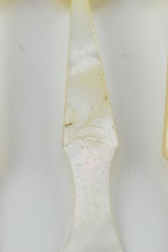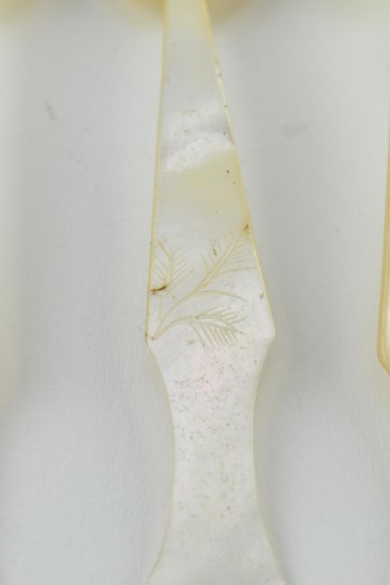 A set of four Qing dynasty carved mother of pearl caviar tasting tea spoons. The spoons engraved with floral and butterfly motifs on the handle. Measures approx. 11cm x 2cm.